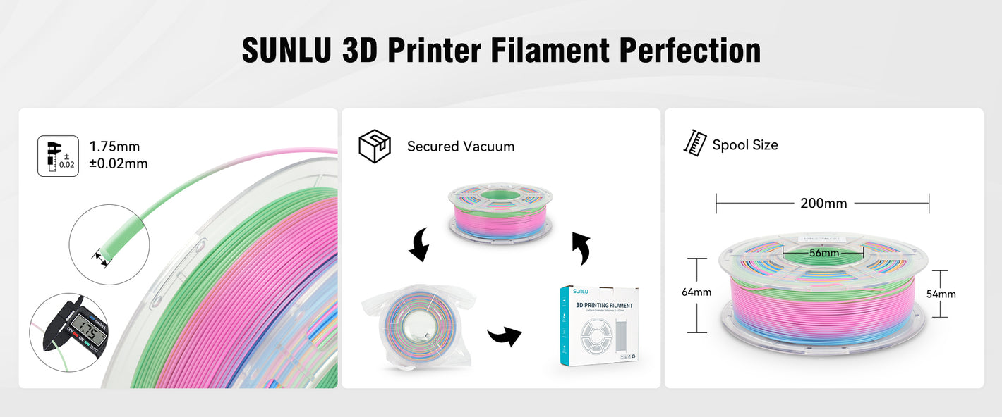 SUNLU Upgraded SILK Rainbow(8Meters Color Change Length ) filament is an upgraded version of the regular SILK Rainbow filament(16m). SILK Rainbow 8M designed to change more colors than other SILK Rainbow, it changes every 8 meters (about 24g).