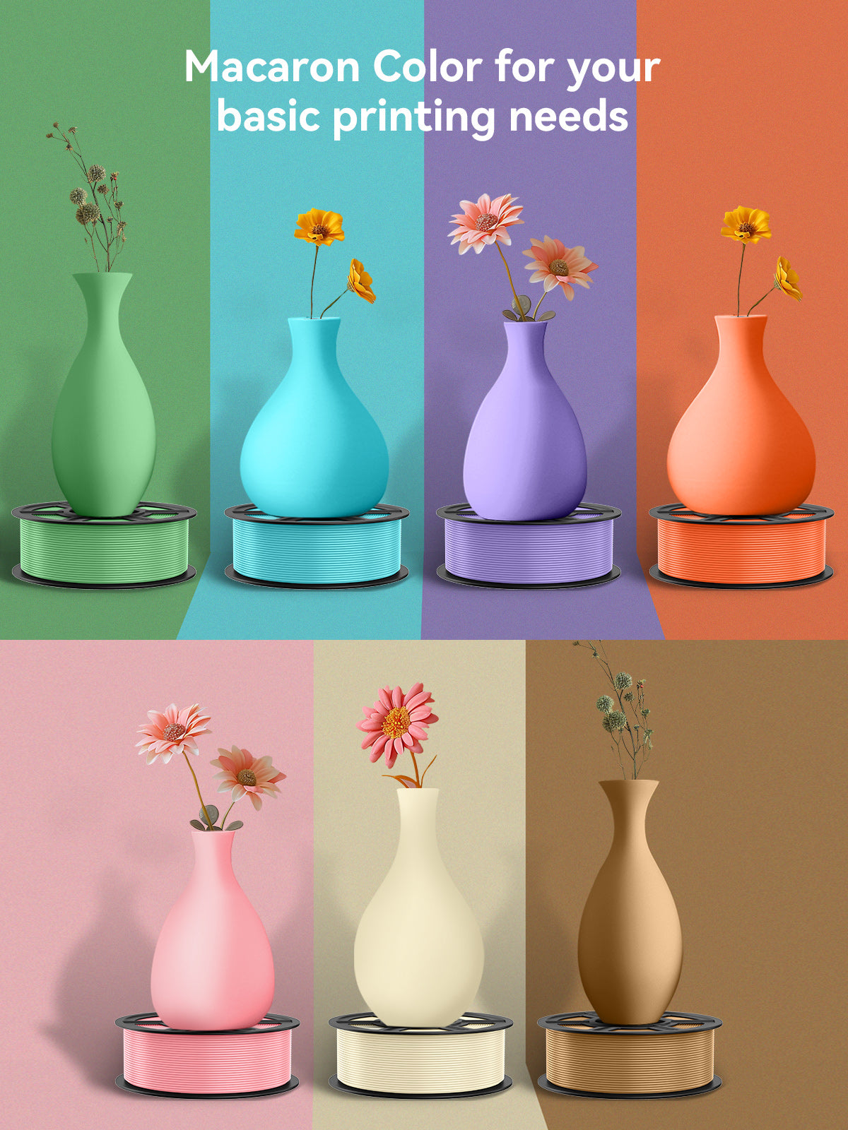 PLA Meta is an upgraded version of PLA, with lower printing temperature, better toughness and softer colors.