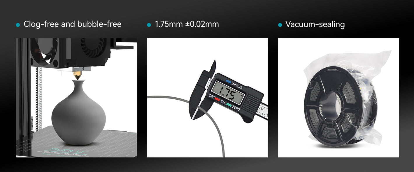 Vacuum Sealed PackagingWe keep PLA filament dry by air tight packaging, avoid moisture absorption of the filament, so that each roll of filament arrives in the user's hands in perfect condition, SUNLU filament quality is consistent.
